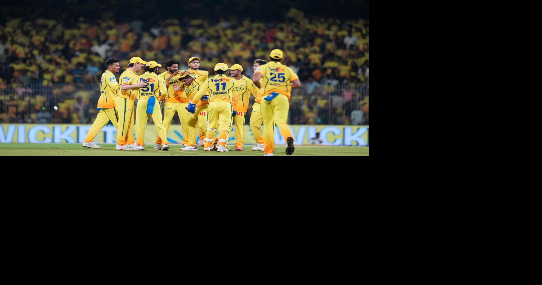 Chennai Super Kings' Sarfaraz Khan, center, celebrates with teammates the run-out of Punjab Kings' Prabhsimran Singh during the Indian Premier League cricket match between Chennai Super Kings and Punjab Kings