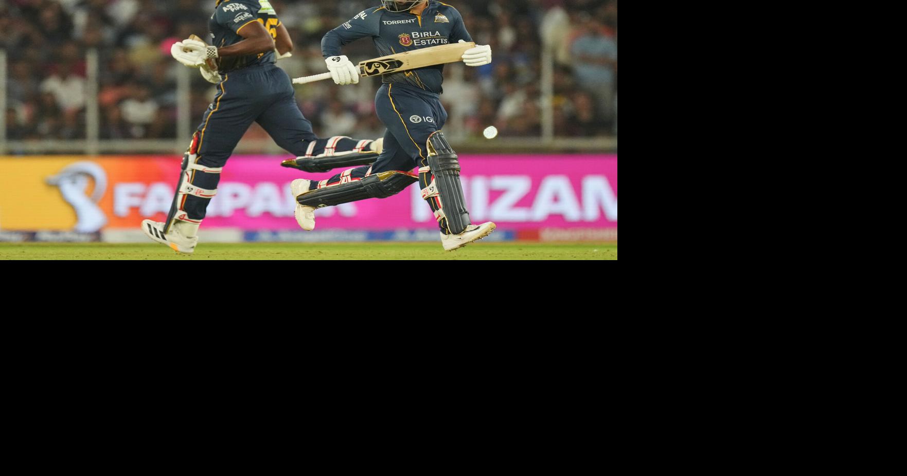 Gujarat Titans' Rashid Khan, right, and Kagiso Rabada run between the wickets during the Indian Premier League cricket match between Gujarat Titans and Rajasthan Royals in Ahmedabad, India, Saturday, April
