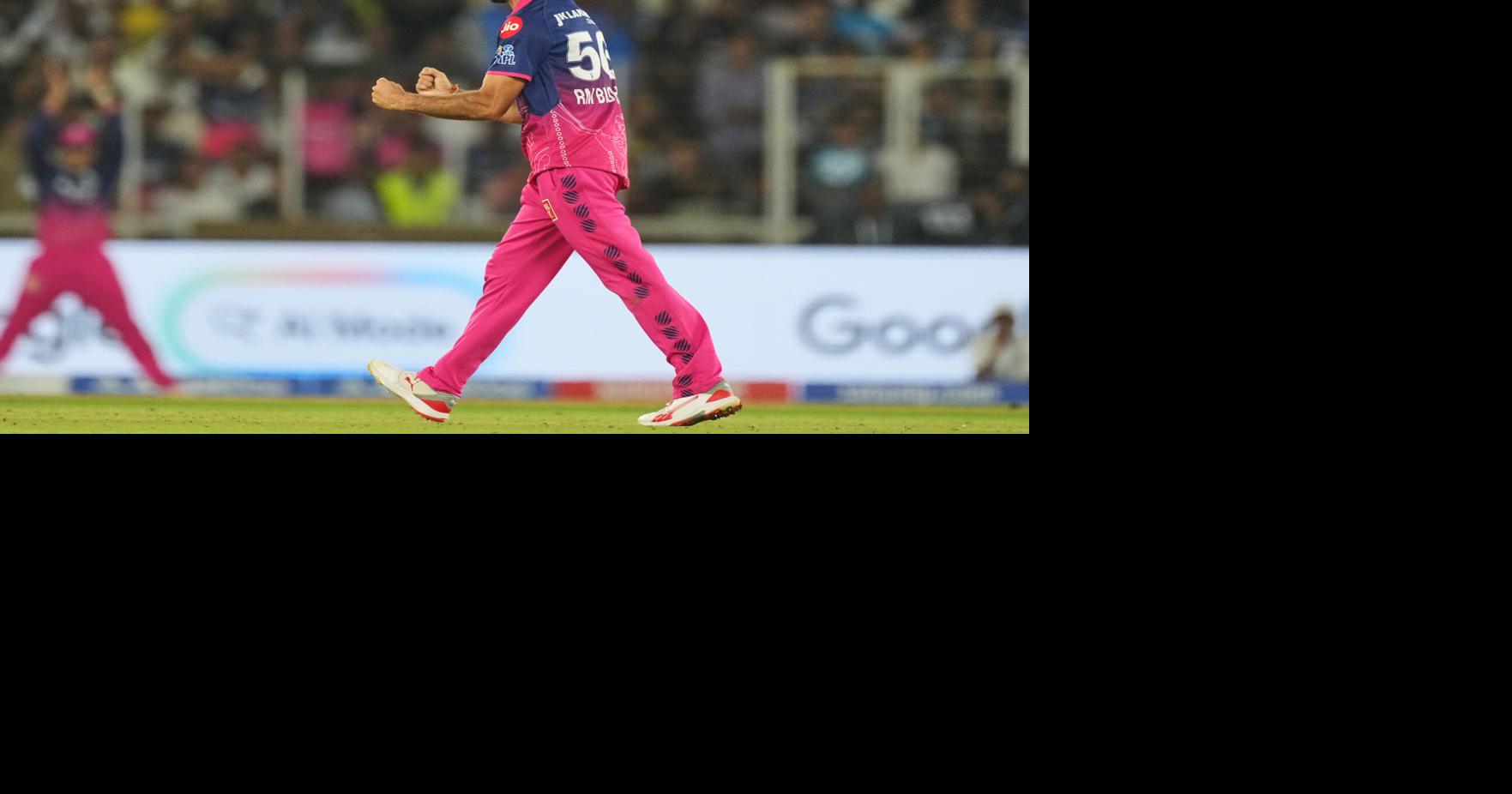 Rajasthan Royals' Ravi Bishnoi celebrates the wicket of Gujarat Titans' Rahul Tewatia during the Indian Premier League cricket match between Gujarat Titans and Rajasthan Royals in Ahmedabad, India, Saturday, April