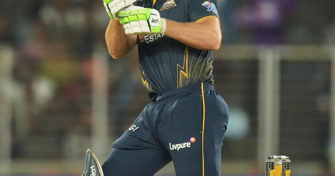 Gujarat Titans' Jos Buttler hits a boundary during the Indian Premier League cricket match between Gujarat Titans and Rajasthan Royals in Ahmedabad, India, Saturday, April 4, 2026. (AP Photo/Ajit Solanki)